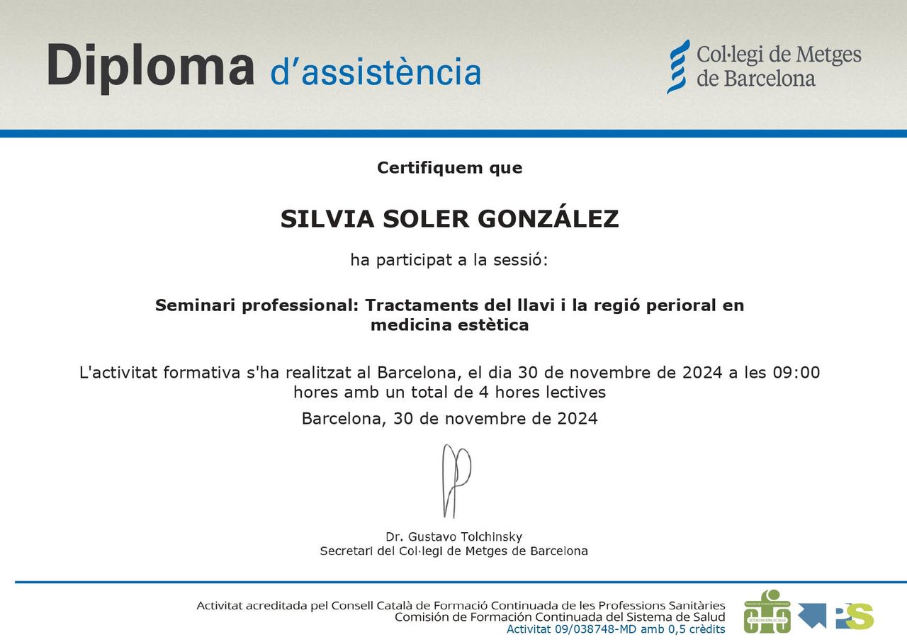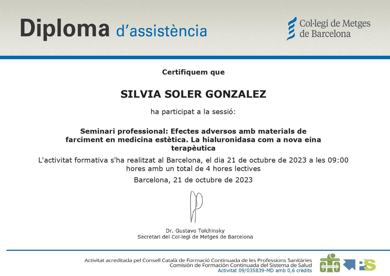 He pertenecido a la Junta de la Sección Colegial de Médicos Estéticos del Colegio Oficial de Médicos de Barcelona (COMB) durante 8 años y he sido la Secretaria en la Junta de la comisión de Acreditación en Medicina Cosmética y Estética del COMB.